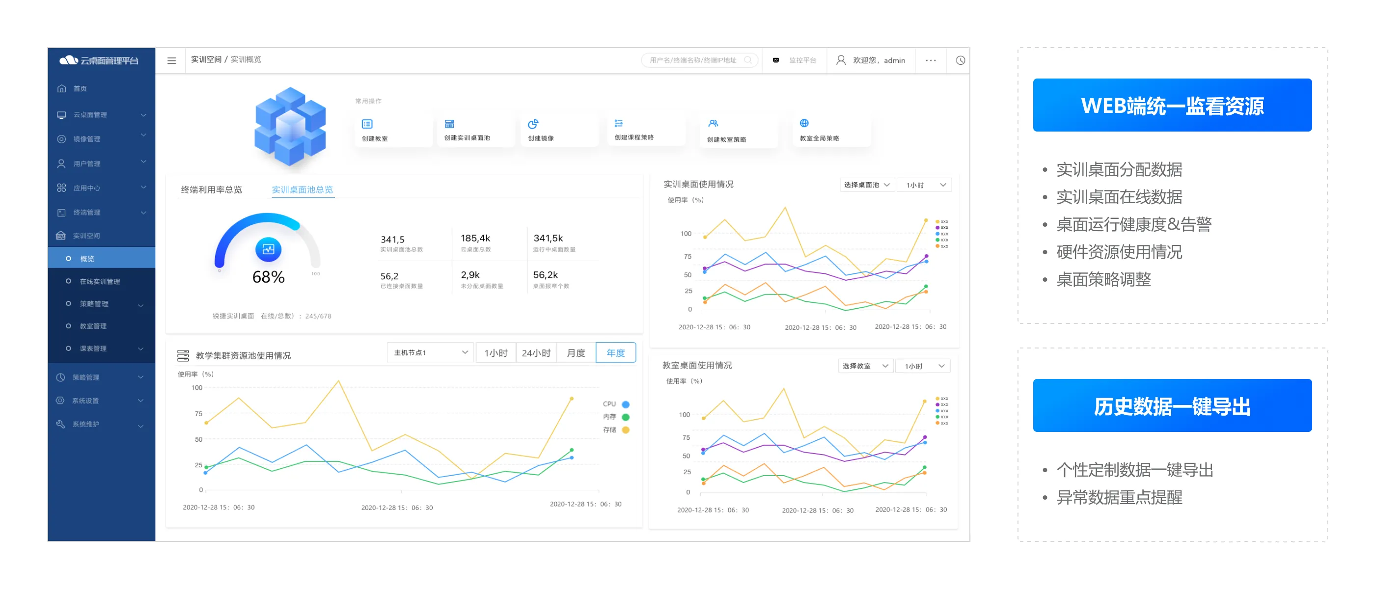 将传统机房桌面资源池化,满足日常教学、项目式实训、科研临时租用、长期办公使用场景,